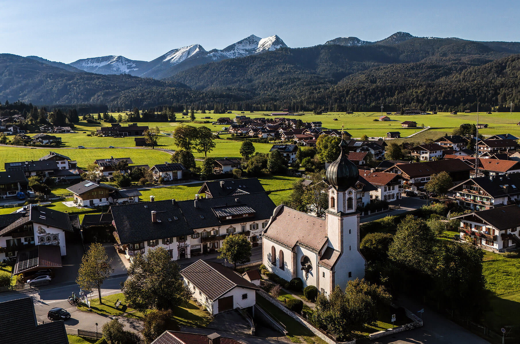 Krün liegt eingebettet zwischen Karwendel-, Wetterstein- und Soierngruppe. Der traditionsreiche Ort verbindet bayerische Ursprünglichkeit mit ruhiger Eleganz. Hier finden Sie klassische Gastlichkeit, kleine Cafés, urige Wirtshäuser und den Charme eines Dorfes, das sich seine Ursprünglichkeit bewahrt hat. Gleichzeitig liegen Sehenswürdigkeiten wie Mittenwald, Garmisch-Partenkirchen oder der Walchensee nur wenige Minuten entfernt.